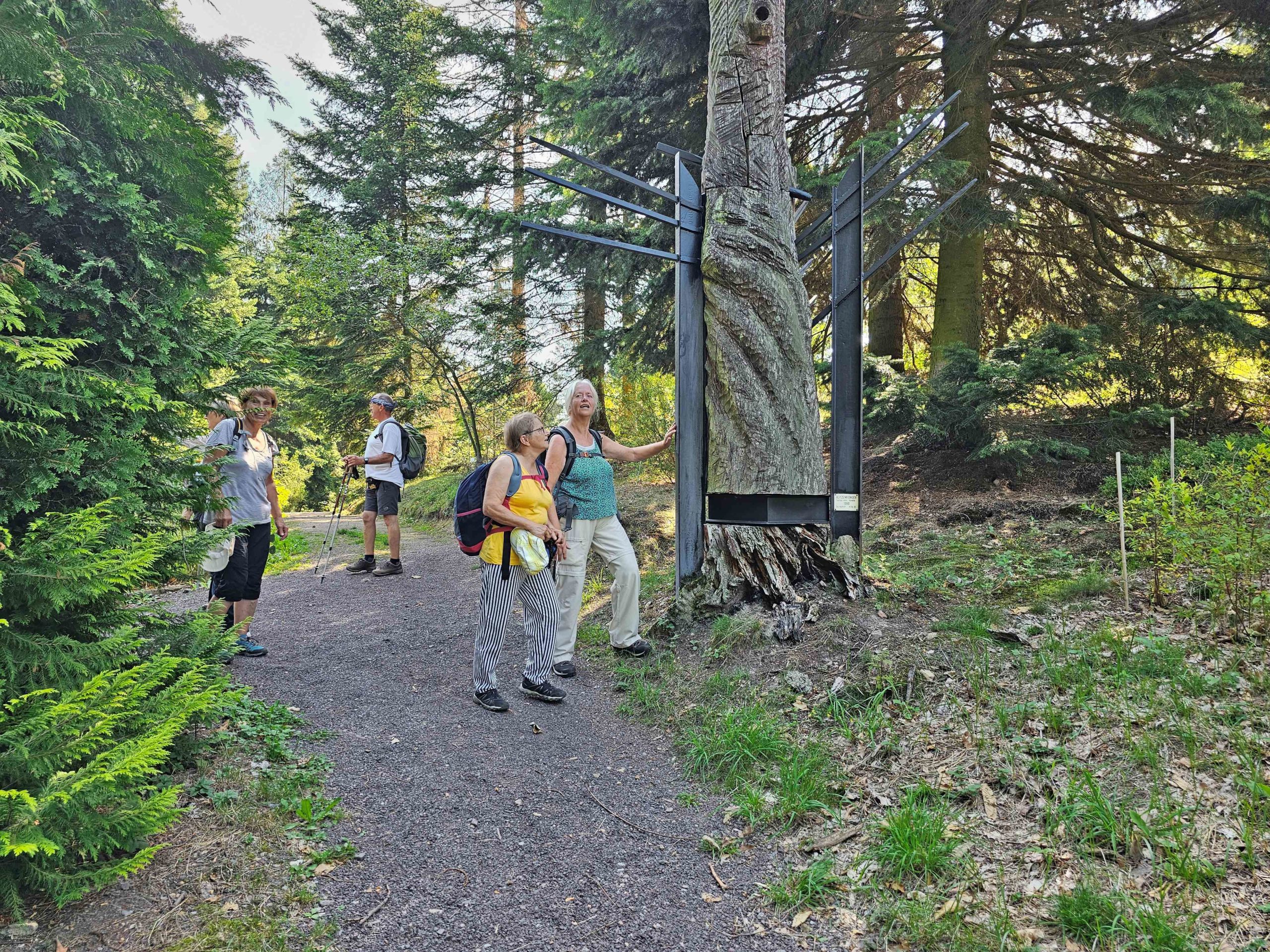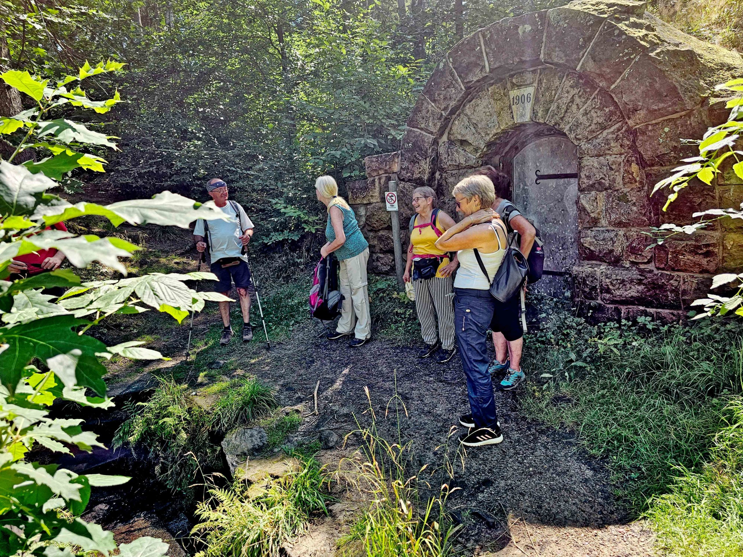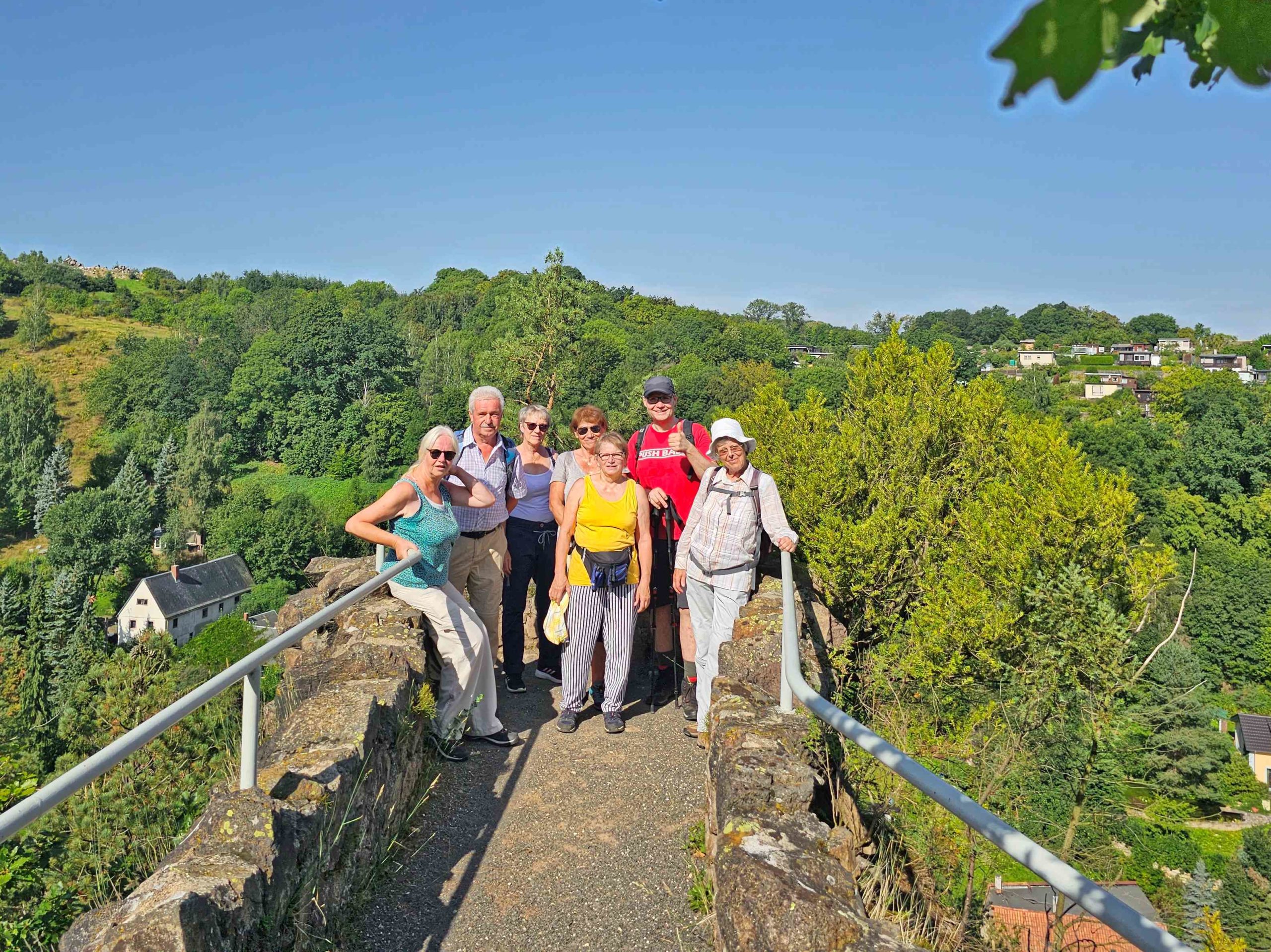 Trotz hochsommerlicher Temperaturen trafen sich am 19. August 2023 acht Wanderer, um die Burgruine, den Forstbotanischen Garten, wo es viel interessantes zu sehen gab, zu erkunden. Weiter bestiegen wir den Aussichtspunkt auf dem „Kienberg“, das „Heinrichseck“, und besuchten diverse Gräber so das „Cotta Grab“ mit seinen 80 gepflanzten Eichen herum. Unser Ziel war nun die Warnsdorfer Quelle mit einer ausgiebigen Mittagsrast. Danach begannen wir schon den Rückweg durch den „Tiefen Grund“ nach Tharandt. Bevor es schließlich gemeinsam und zufrieden mit dem Zug nach Hause ging, erholten wir uns nach der anstrengenden Wanderung in der Gaststätte „Bahnwärterhäuschen“ und trotzten den hohen Temperaturen mit erfrischenden Getränken.