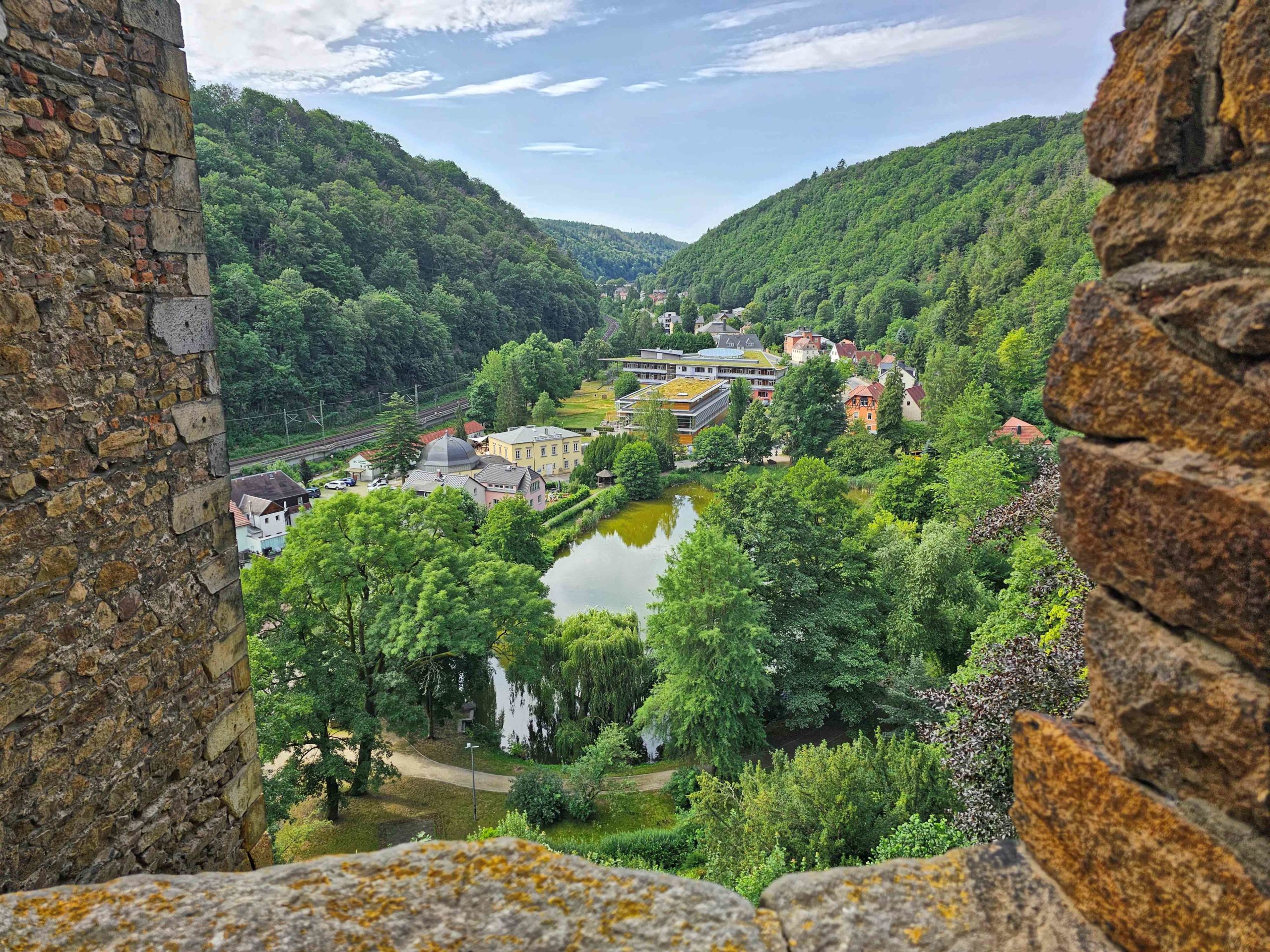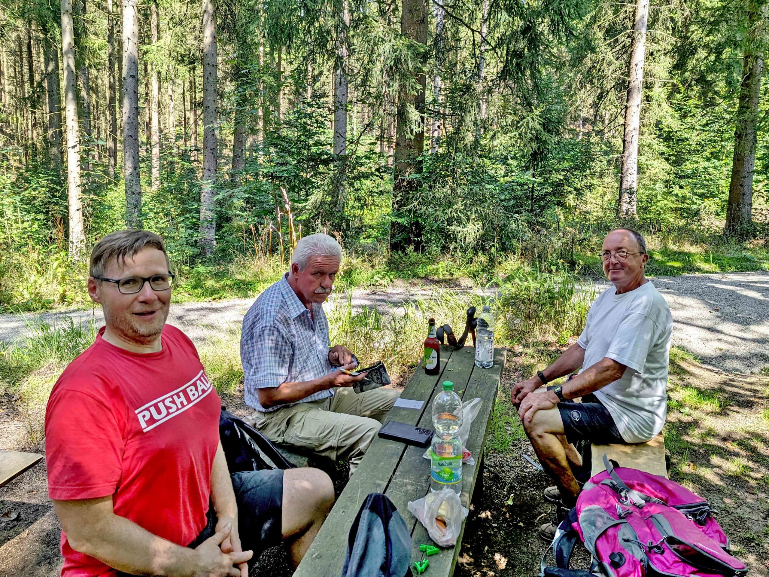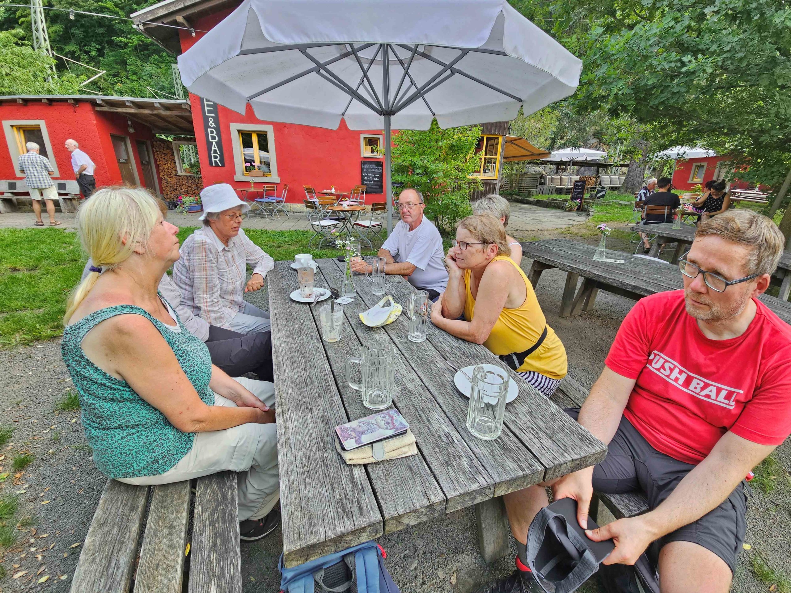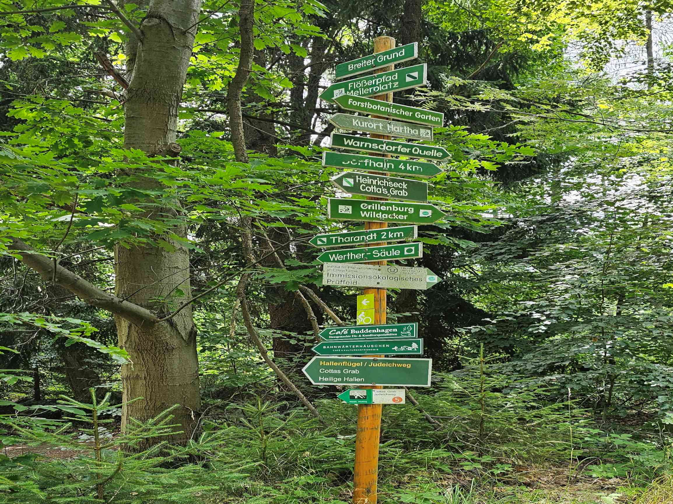 Trotz hochsommerlicher Temperaturen trafen sich am 19. August 2023 acht Wanderer, um die Burgruine, den Forstbotanischen Garten, wo es viel interessantes zu sehen gab, zu erkunden. Weiter bestiegen wir den Aussichtspunkt auf dem „Kienberg“, das „Heinrichseck“, und besuchten diverse Gräber so das „Cotta Grab“ mit seinen 80 gepflanzten Eichen herum. Unser Ziel war nun die Warnsdorfer Quelle mit einer ausgiebigen Mittagsrast. Danach begannen wir schon den Rückweg durch den „Tiefen Grund“ nach Tharandt. Bevor es schließlich gemeinsam und zufrieden mit dem Zug nach Hause ging, erholten wir uns nach der anstrengenden Wanderung in der Gaststätte „Bahnwärterhäuschen“ und trotzten den hohen Temperaturen mit erfrischenden Getränken.